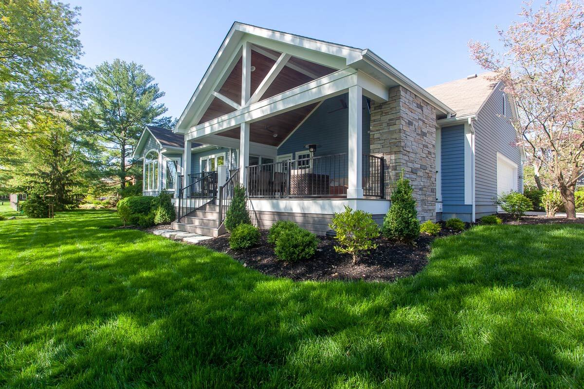 These Montgomery homeowners wanted a larger, more comfortable outdoor living area to enjoy throughout the year. The new space we created is covered to provide protection from the elements in every season and features lights, a ceiling fan, and a gorgeous stone gas fireplace. A separate, versatile dining and seating area offers plenty of room for gatherings or for a quiet evening watching a movie by the fire.