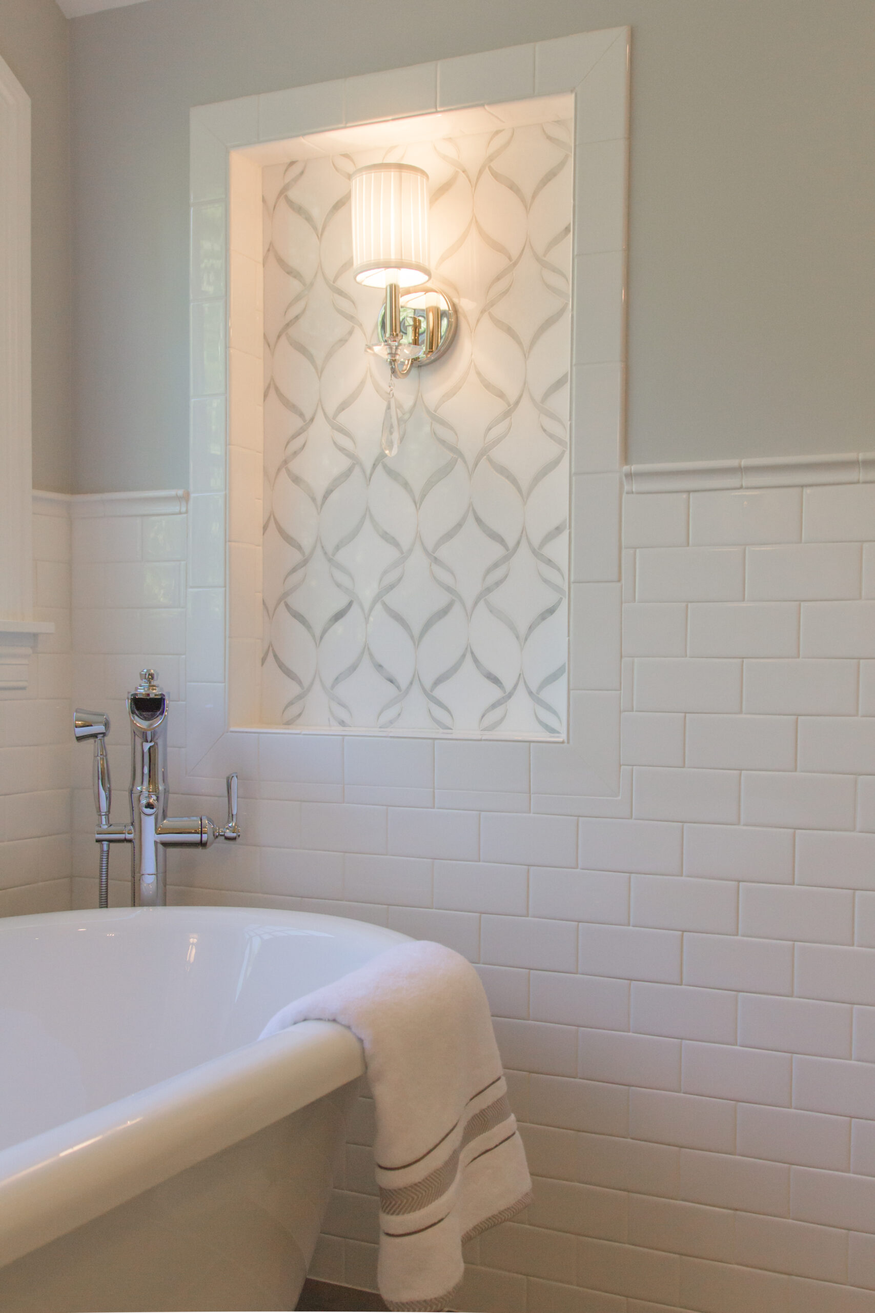 These homeowners contacted us to update both their master and guest bath. The new master bath is large, open, and airy. A freestanding tub sits within a recessed archway with custom tile wall niches housing wall sconces. The expansive walk-in shower has a half wall topped with glass to allow natural light to brighten the shower. Custom storage in the vanity, along with a tall, recessed cabinet, make it easy for these homeowners to keep their bathroom organized and clutter-free.