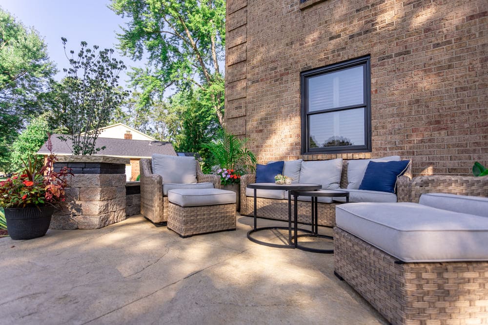 Our porch addition plans were full of goodies and extras! We adore this front yard outdoor living space. We began with a textured concrete patio, then added landscape seating walls for conversation and congregating. Built-in patio seating is one of our top must-haves for new outdoor spaces. We absolutely love the details in this patio stone wall. It was important that this space was equipped for an event at any hour, including custom LED hardscape lighting. A sprinkling of patio wall lights and inset LEDs ensures a romantic or practical option for every occasion for illumination. Landscaping around such a perfect patio is vital. We poured our outdoor living design expertise into the landscaping around this concrete patio to provide the expected appeal in a high-end outdoor hardscape. While the beauty of the landscaping is that it can be evolved and upgraded, a superb start was vital for the first day in this outdoor gathering space.